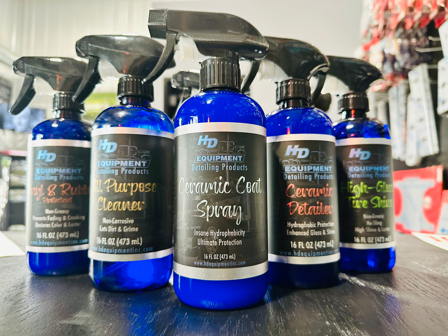 includes - ceramic coat spray, ceramic detailer, high gloss tire shine, all purpose cleaner, vinyl & rubber protectant, and glass cleaner