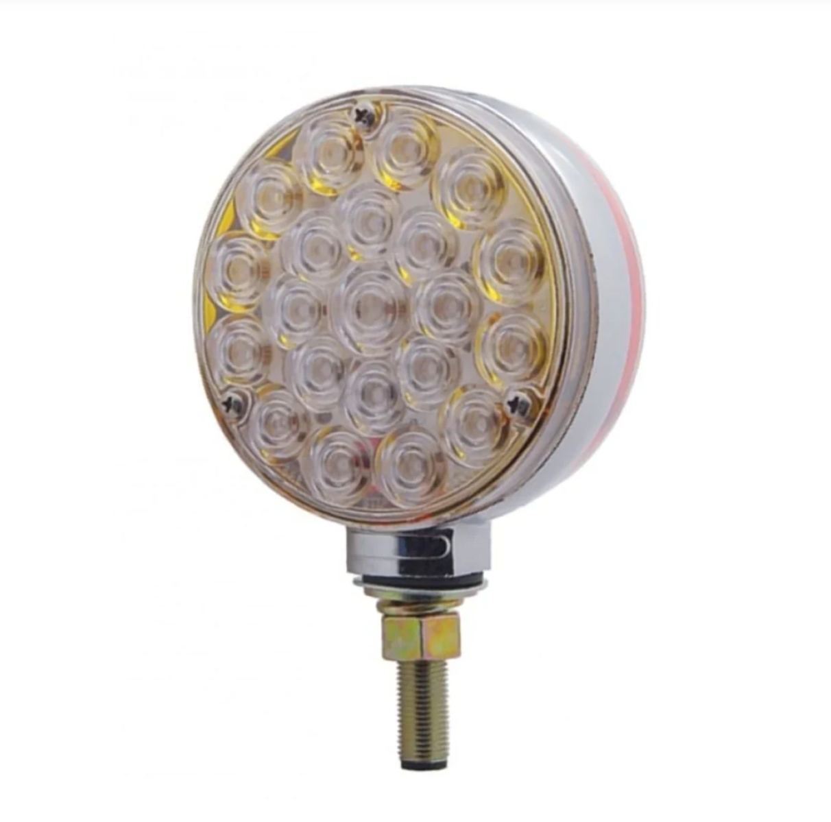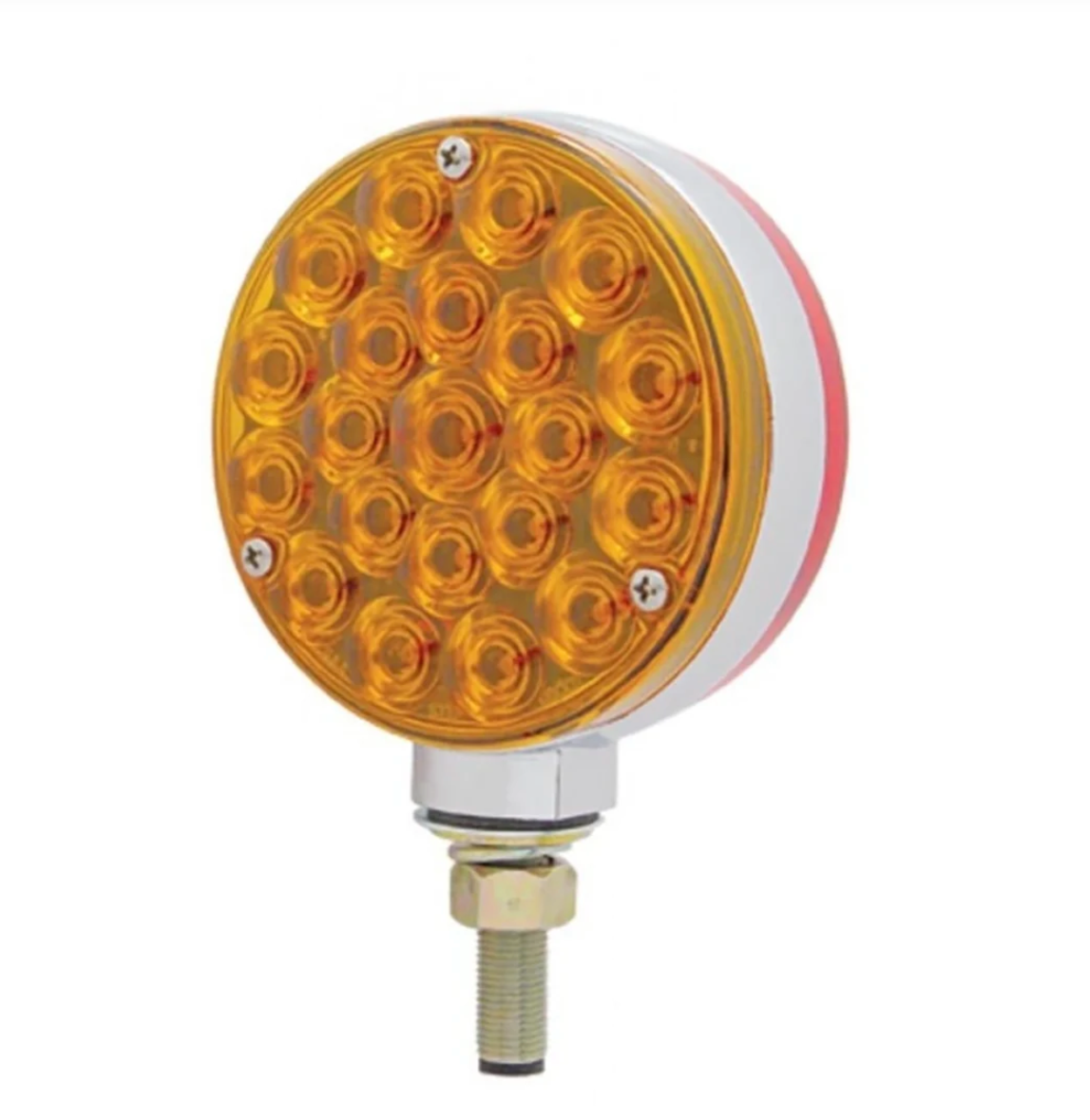United Pacific LED amber/ red 4" round double faced turn signal light. Amber and red lights with colored or clear lenses 21 diode each face. Not only do LEDs look better and brighter, but they also last way longer than their incandescent counterparts. Outfitting your big rig with LEDs will allow other drivers to see you better at night while lighting the road better than before.